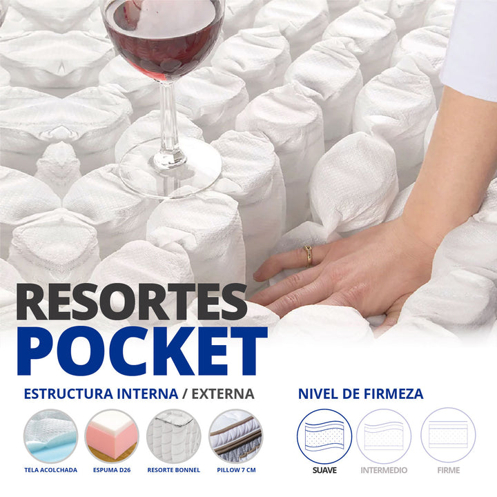 - Núcleo con resortes Pocket (encapsulados) Mayor estabilidad y duración.